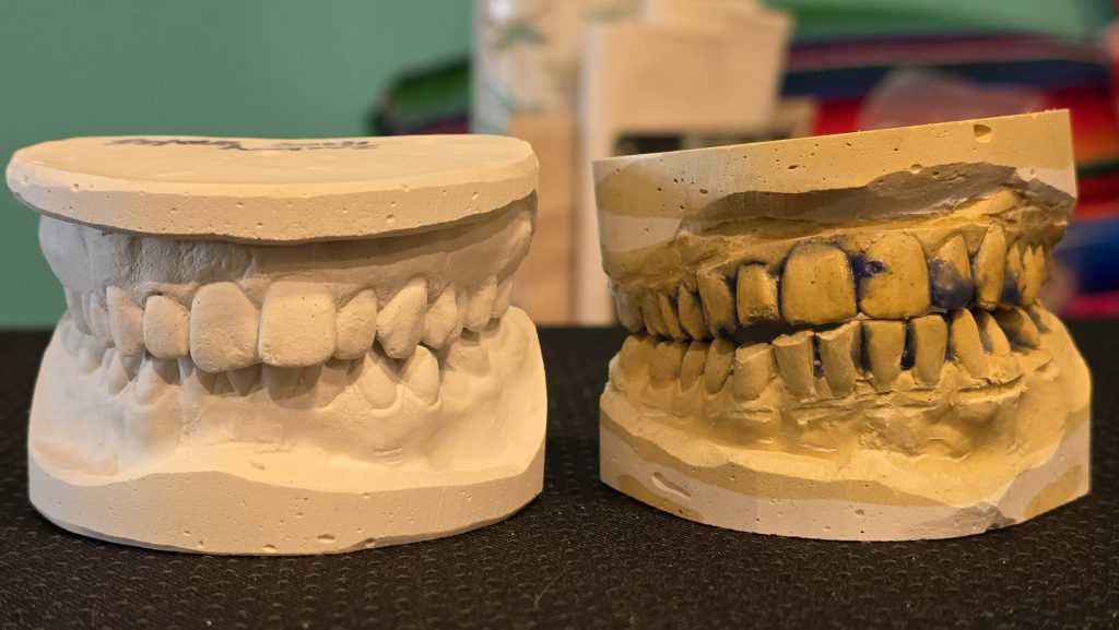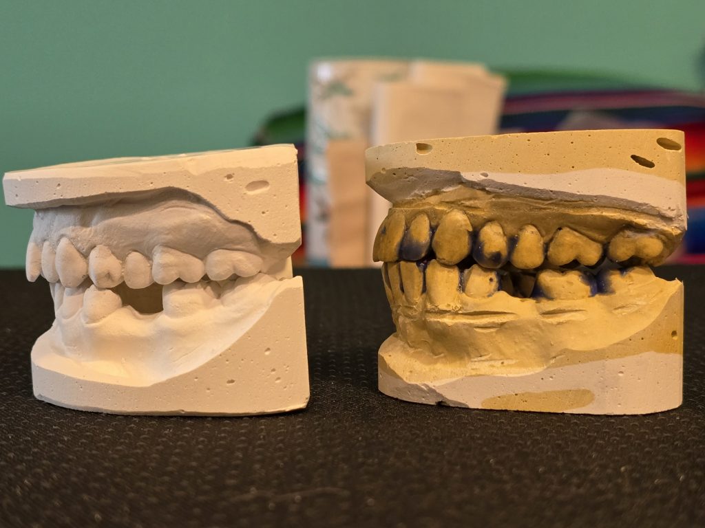 Before and after shots! The blue color on the “after” model (separate of the chipping, which just happened when it came out of the mold) is some sort of dye they use for their ‘after’ model showing where they used the most tension on the wires, apparently, in the treatment plan? I might have that goofed up.